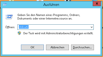 Als Domänen-Administrator Start → Auführen „ntdsutil“. Es öffnet sich ein Commandpromt des Ntdsutil.